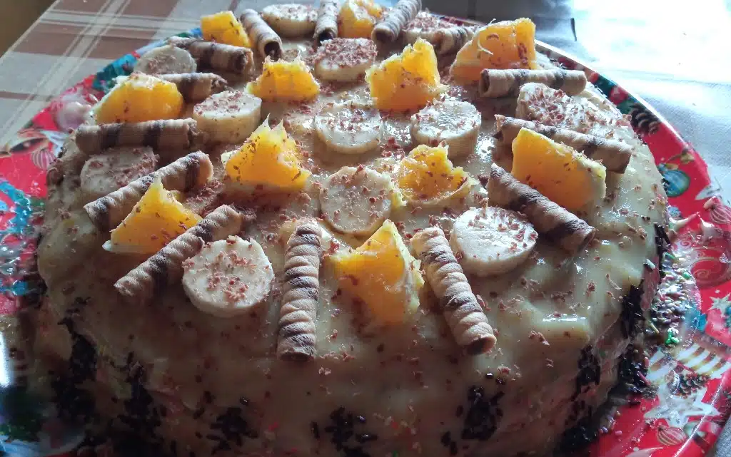 Започваме да подреждаме тортата. Слагаме блат и напояваме с компот по избор. След това намазваме с крем и редим банани и така докато свършат блатовете. Най-отгоре украсявам с банан, портокал, пурички, шоколадови стърготини и настърган шоколад. Престоява няколко часа и е готова за консумиране.