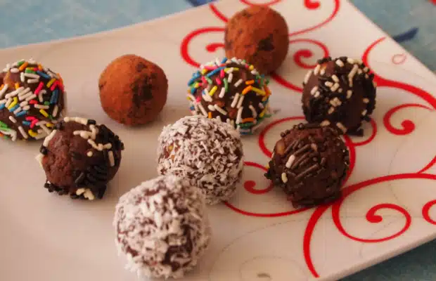 С ръце оформяме топчета, докато сместа е още леко топла и овалваме в шоколадовите пръчици, кокосовите стърготини, какаото или смлените ядки. Оставяме в хладилник за няколко часа, за да стегнат добре.