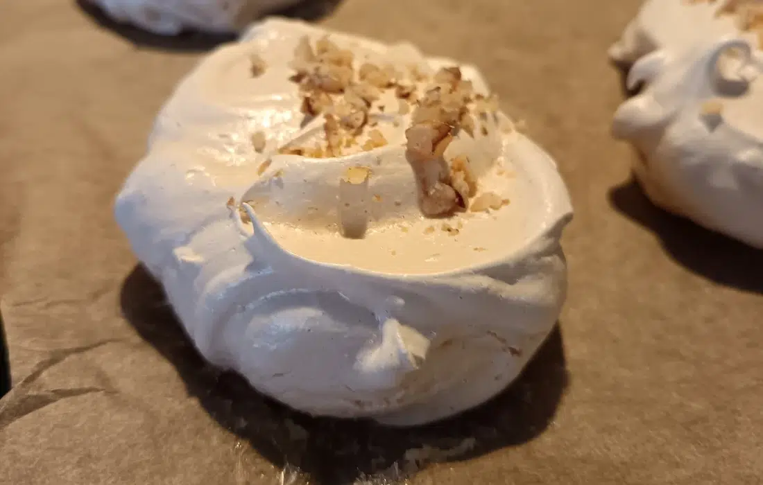С помощта на лъжица се оформят целувки в тава, покрита с хартия за печене (по около 1 лъжица за брой). Повърхността леко се заглажда, а отгоре може да се поръсят ядки.