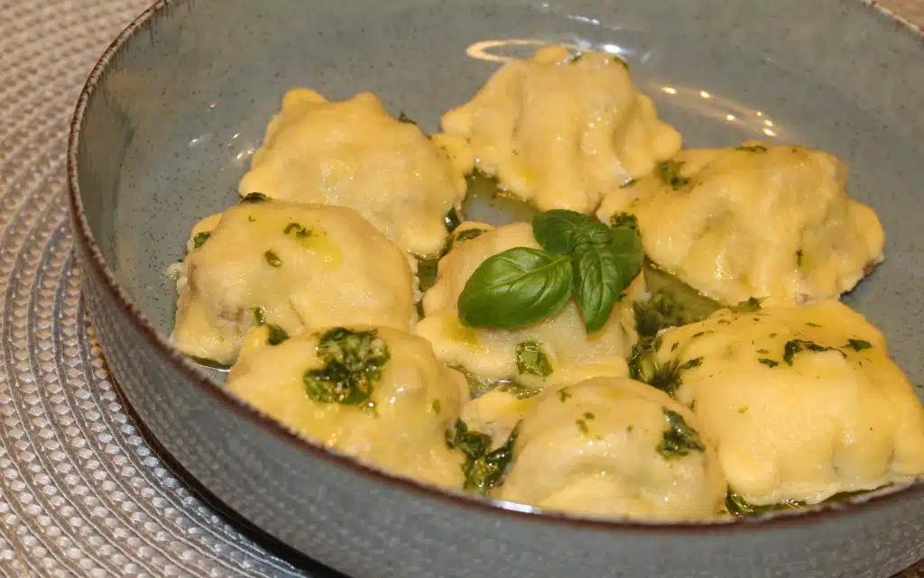 Приготвяме пестото като пасираме зехтина, обеления чесън, листата босилек, сол и натрошените орехи. Сваряваме пастата за около 6-7 минути в подсолена вода и поднасяме с пестото. По желание поръсваме с твърдо сирене. Времето за варене варира в зависимост от дебелината на корите и големината на равиолите.