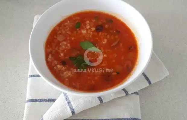 Малко преди да е готов доматът, се добавя и оризът, за да покъкри заедно с него, като по този начин омеква и поема доматената консистенция. Добавят се солта и черният пипер.