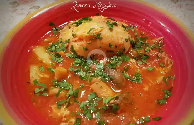 Доматена яхния с пиле, гъби и картофи