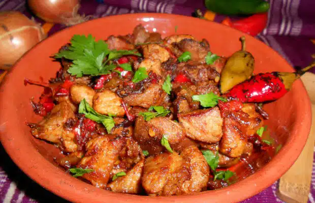 Нарежете месото на кубчета, лука на полумесеци, а чушките на кръгчета. Запържете месото в голям тиган с олиото до зачервяване. Добавете лука и чушките към него и започнете да раздрусвате тигана, за да се задушат добре. Овкусете с черен пипер и сол на вкус. Гответе до готовност. Накрая добавете червен пипер и поръсете с нарязан на ситно магданоз.
