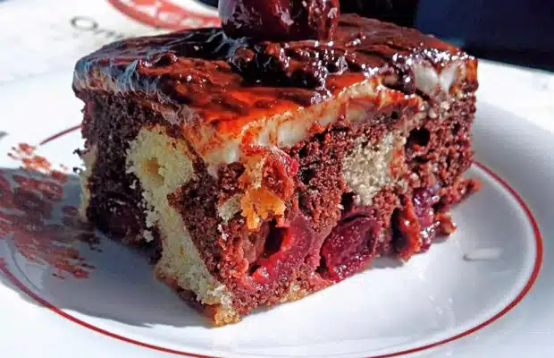 Сипете в тавата първо бялата смес, разпределете я равномерно, отгоре сипете какаовата, като с помощта на шпатула или лъжица я разпределете равномерно върху бялата. Най отгоре наредете черешите без да ги притискате. По време на печене те си потъват в тестото.
