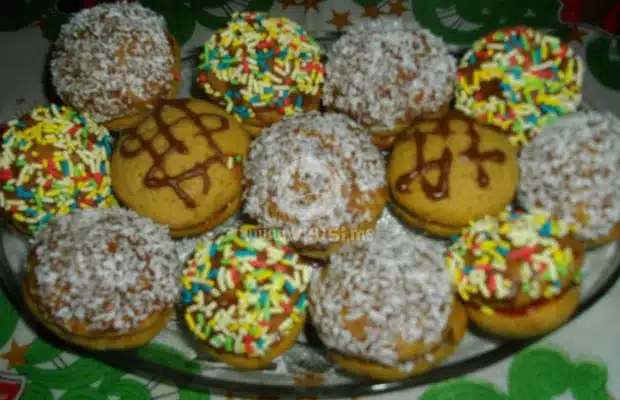 Печем в загрята фурна 150 градуса около 12-15 минути. Изваждат се и се оставят 5 мин. в тавата да стегнат. После две по две се слепват със сладкото. Отгоре се намазват с разтопен шоколад и се поръсват с кокос и захарни пръчици! Нека ни е цветно и вкусно на Коледа!