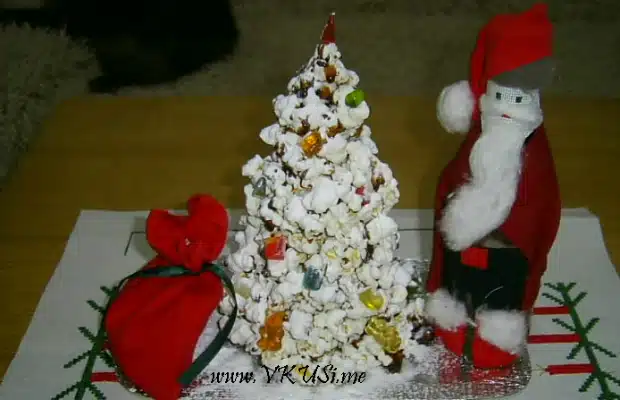Стопявате захарта на карамел, потапяте всяка пуканка и ги слепвате една с друга, като по този начин оформяте елхичка. Поръсвате елхичката с пудра захар и я украсявате с нарязаните желирани бонбонки.