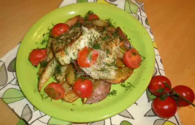Сервирайте, като сложите печени картофи в средата на чинията, отгоре по две парчета от рибата и част от доматчетата. Поръсете със ситно нарязан пресен копър.