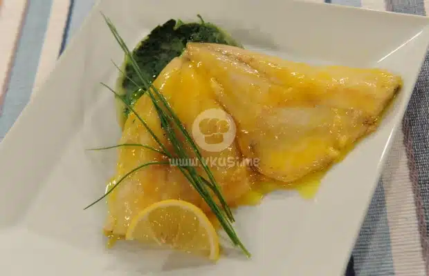 Изцедете картофите и спанака, смачкайте ги и сервирайте в чиния, а отгоре рибата, полята със соса от портокали.