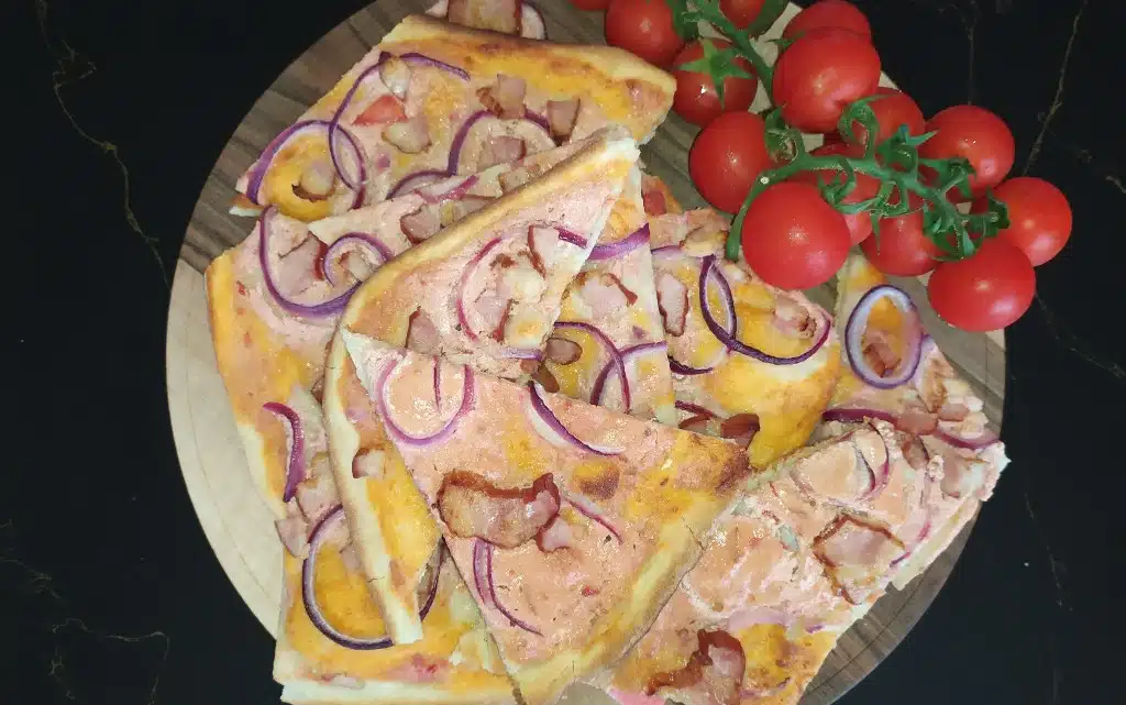Щом тестото удвои обема си, се разточва тънко, намазва се със сместа от сметана и лютивка, покрива се със шайбите лук и нарязания бекон и се пече в загрята на 240 градуса фурна. Изпича се бързо, защото тестото е тънко и фурната е силно загрята. Приятен апетит!