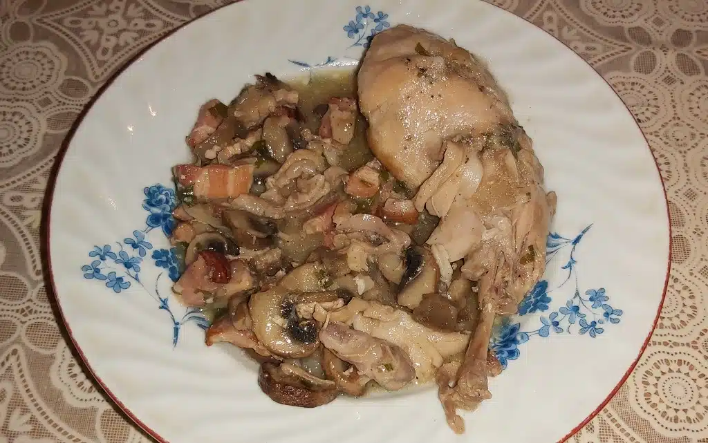 Нарязваме заека. Запържваме бекона, без да добавяме мазнина, защото той си пуска. В тенджера слагаме готовия бекон заедно със заека и лука, освен мазнината от бекона от мен сложих и още масло.