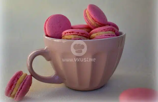 Печете макароните в загрята фурна по средата за 15 минути на 150 градуса. Не затваряйте плътно вратичката, за да излиза влагата. Готовите макарони трябва да образуват поличка след печене или крачета, които не бива да са с диаметър по-голям от самата основа. Оставете да се охладят и отлепете внимателно от хартията.