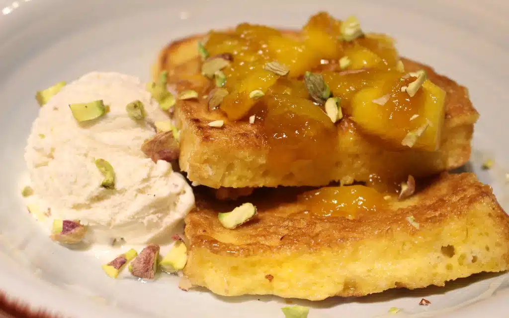 В същия тиган за минута-две задушаваме кубчетата манго. Добавяме меда, коняка и оставяме на котлона, докато алкохолът се изпари. Поднасяме тоста с мангото, топка сладолед и нарязаните на едро ядки.