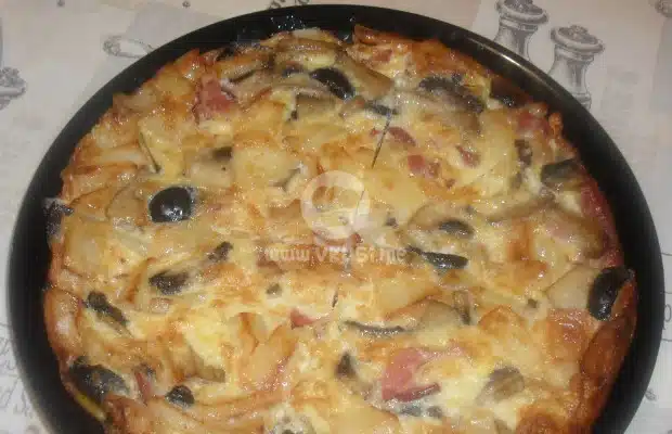Прехвърляме всичко в намазнена с масло тава. Печем в загрята на 180 градуса фурна. След като се опече режем на триъгълници.