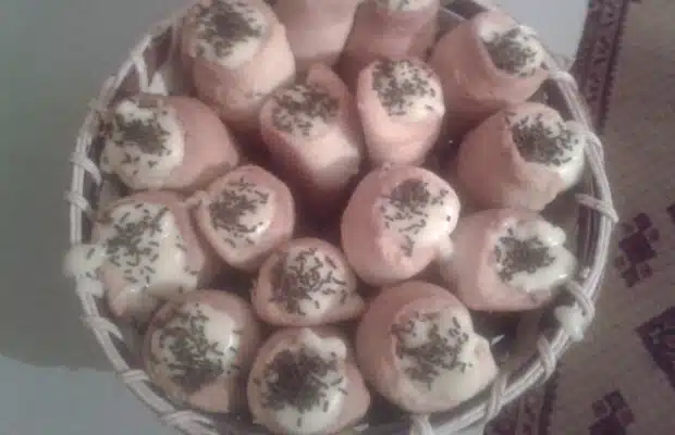 Увиваме по формичките – започваме отдолу, като прищипваме тестото, за да не се отвори при печене и на горе навиваме лентата като спирала, като леко застъпваме долния пласт отдолу и да върви към горния разширен край до събирането на двете страни на фунийката. Печем в умерена фурна 180 градуса до леко розов цвят.