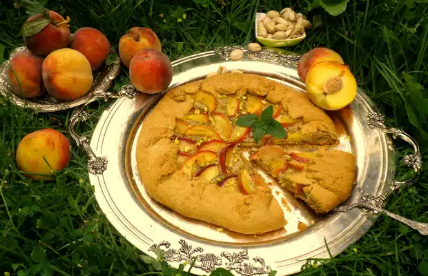 Получената ядкова паста се разпределя върху маслената кора и отгоре се подреждат прасковите. Краищата на тестото се сгъват навътре, така че да покрият част от пълнежа. Може да си помагате с хартията за печене, за да не се разчупи тестото.