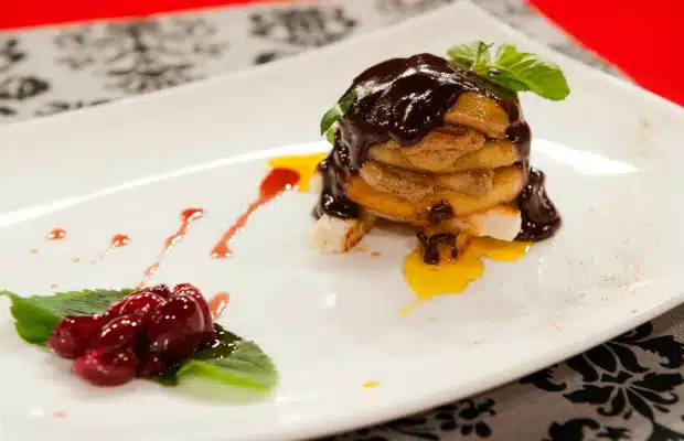 Сервираме парченцата хляб, отгоре парче ябълка, гъши дроб, пак ябълка, листа от мента за декорация. Заливаме с шоколадов пикантен сос.