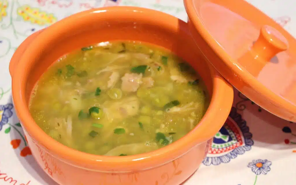 Запържваме нарязания на ситно зелен лук. Добавяме картофа, нарязан на кубчета и подправките. Заливаме с малко топла вода или бульон. След като картофа омекне, добавяме граха. Оставяме да къкри десетина минути. Докато още супата е на котлона, пасираме част от граха и картофа. Така ще добие плътност и гъстота. Добавяме накъсаното месо и оставяме за още 5 минути на котлона. Поднасяме, поръсена с магданоз.