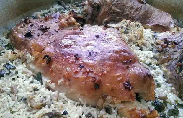Агнешкото се обръща, докато не получи червена коричка и от двете страни. Когато е готово, добавяме консистенцията с ориза в тавата около месото в соса, докато не се свари.
