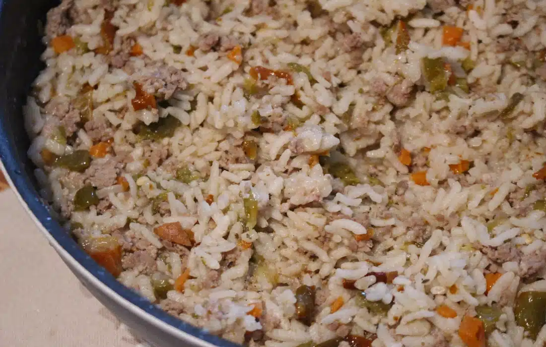 Подправяме сместа със сол, черен и червен пипер, джоджен. Прибавяме и добре измития ориз и добавяме малко вода. Оставяме да къкри до готовност на ориза. Сваляме от огъня и добавяме нарязаните на ситно предварително изпечени и обелени чушки.
