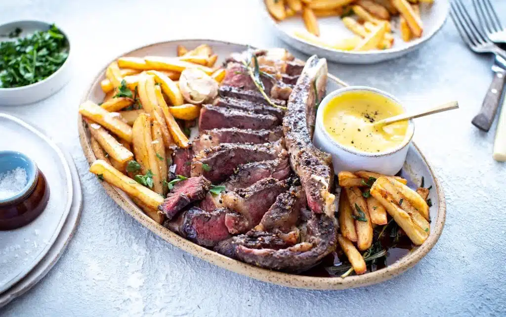 Работната седмица ще започнем със сериозна порция стек и пържени картофи. Към тях ще добавим хубав сос айоли и чаша охладено вино за разкош. Добър апетит, приятели! 🙂