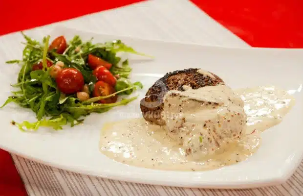 За месото: Стековете се подсушават с домакинска хартия и се намазват с тънък слой горица от двете страни. Месото се пържи в предварително загрят тиган със зехтин, по 3-5 мин. от всяка страна. Стековете се поръсват се със сол и черен пипер, завиват се в алуминиево фолио и се оставят така 5 мин.