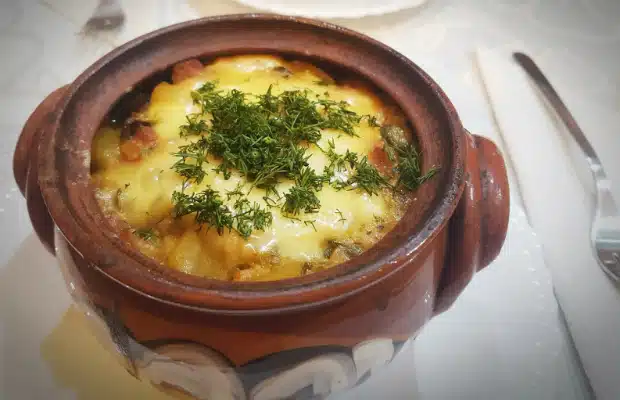 Гювечета с картофи, гъби, шунка и топено сирене