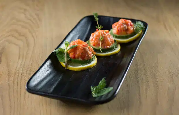 Нарежете краставицата и лимона на шайби. За да сглобите хапките, сложете краставицата върху лимона и покрийте със сместа със сьомгата. Гарнирайте с каперси и мента.