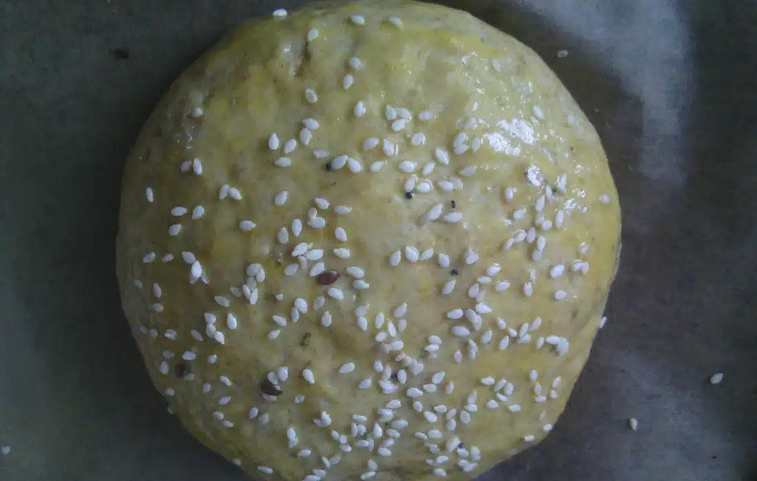 Замесваме тестото. Прехвърляме го на месата и го доомесваме. Слагаме хляба в тава, застлана с хартия за печене. Мажем го с четка с остатъка от яйцето и поръсваме със сусам. Печем в загрята на 190 градуса фурна до готовност.