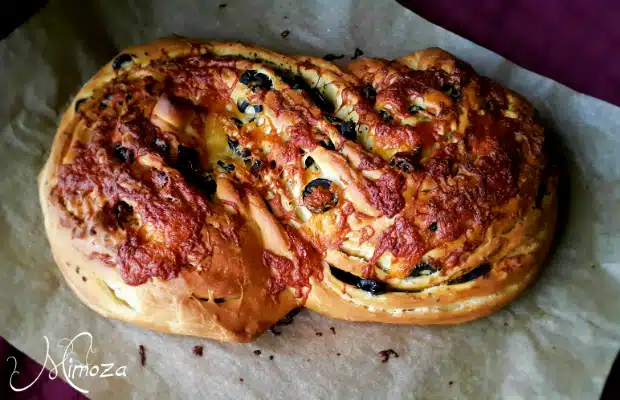Влюбих се в този хляб от пръв поглед. Съставките, начина на оформление, всичко в него те кара мислено да се пренесеш в слънчева Тоскана. 🙂 Поводът за този хляб бяха едни наскоро купени сушени домати, които се чудех какво да правя. Така случайно попаднах на рецептата в блога на Мина Ангелова. Леко промених някои от съставките – според нашия вкус и наличните вкъщи.