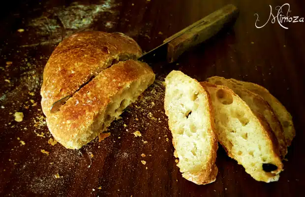 В голяма купа се смесват брашното, солта и маята. Прибавя се водата и се разбърква с дървена лъжица, докато се смесят всички съставки. Получава се „рошаво“ тесто. Не трябва да се меси или да се бърка дълго време.