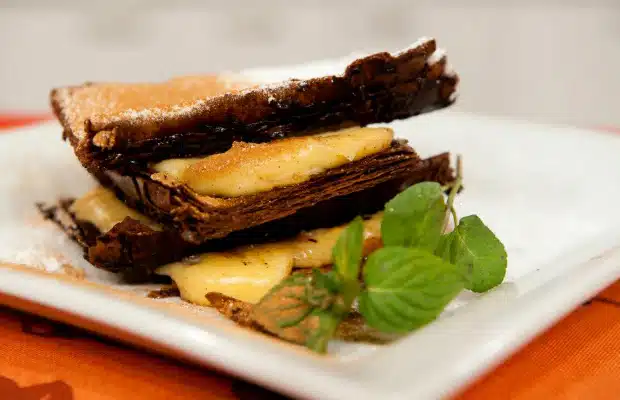 Изваждаме готовите кори, разрязваме на четири и сервираме като редуваме кора и крем. Последният пласт трябва да е от кора, а отгоре поръсваме с пудра захар и канела.