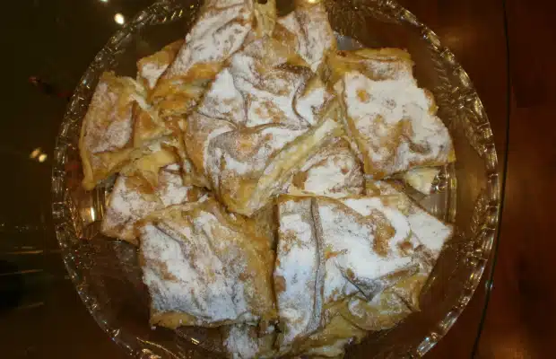 Отново намазваме с олио и слагаме няколко лъжици разбити белтъци и натрошено сирене. Така, докато се разточат всичките топки. Последната отгоре намазваме с олио и печем в загрята фурна до зачервяване. След като изстине се поръсва с пудра захар. Много е вкусна студена.