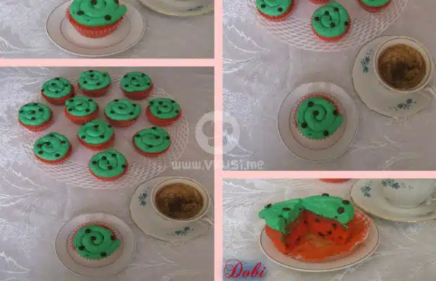 Печете в загрята фурна до готовност. Извадете и охладете. Разбийте сметаната, оцветете я със зелена боя и декорирайте кексчетата.