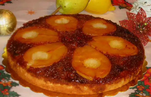 Изсипете сместа върху крушите. Печете на 180градуса, около 40 минути. Оставете леко да се охлади и обърнете в подходяща чиния/подложка.