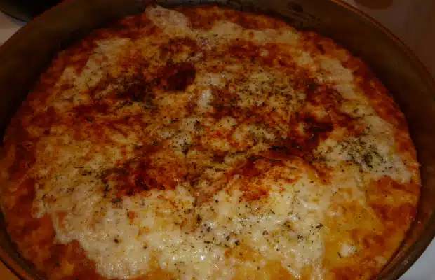 Пече се в предварително загрята силна фурна за 15 мин., след което се поръсва с настърган кашкавал, червен пипер и чубрица и накипа се допича за още 5 мин.