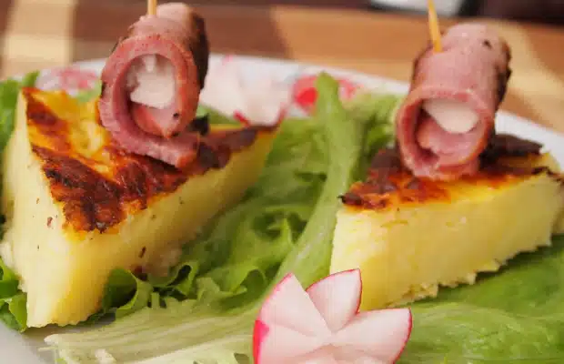 Шунката (филето) запичаме за 2-3 минути от двете страни в грил тиган. Във всяко парче поставяме резен бяло саламурено или друг вид сирене и завиваме на руло. Прихващаме с клечка за зъби и поставяме всяко „платно“ върху триъгълно парче от огретена. Украсяваме с цветя от репички.