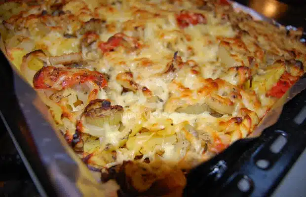 Всичко това поставете в предварително загрята фурна до 200 градуса на вентилатор. Добавете всички подправки. Посолете леко и напръскайте зеленчуците с шепа вода. Печете около час. Преди да са готови настържете кашкавал и поръсете с него обилно зеленчуците. Запечете за още 5 минути. Приятен апетит!