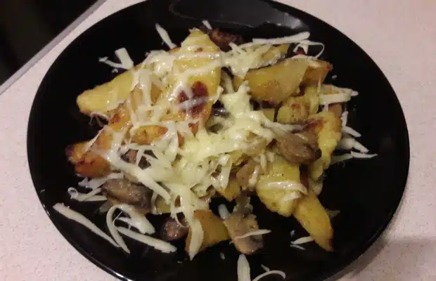 Първо белим картофите и лука, а след това режем на едро гъбите, кромида и картофите. Слагат се в тавата, като към тях се добавят солта, соевият сос и зехтинът.