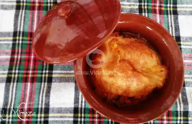 По същия начин се приготвя и втората порция. В купа се смесват останалите продукти. Сместа се разпределя по равно в двете гювечета. Пекат се затворени в предварително загрята на 200’С за 20-30 минути.