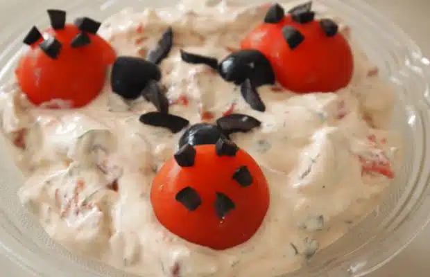 Магданозът нарязваме на ситно, а чесънът пресоваме. Чушките нарязваме на по-едри парчета, натрошаваме сиренето. Смесваме всички продукти и разбъркваме добре. Украсяваме като оформяме калинки от чери доматчетата и маслините.