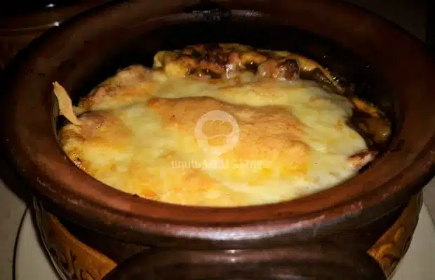 Сега е ред на омлетите. За един ще ни трябват две яйца, разбити добре с малко прясно мляко. Когато ги изпечем, слагаме омлетите на дъното на гювече, като се стремим омлета да покрие и стените на гювечето. След това ги пълним с кавърмата.
