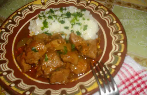Смесват се счукания чесън, канела, червен пипер, мащерка, чубрица, 1 с.л. зехтин, сол и черен пипер на вкус и разбъркваме в малка купа. В тиган се загрява зехтин или олио и в него се запържват кубчета свинско месо. След като хванат хубав загар ги слагаме в отделен съд.