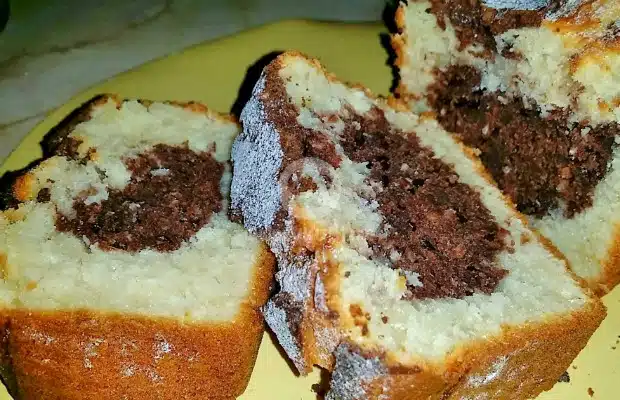 Сложете хартия за печене във форма за кекс, изсипете бялата смес, а в средата и изсипете какаовата, без да разбърквате.