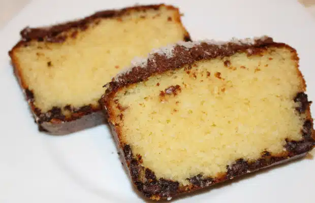 Намажете формичката за кекс с масло и поръсете с брашно. В нея изсипете сместа и печете на умерена фурна (170-180 градуса ) до пълна готовност. Готовият кекс извадете и поставете още топъл в десертна чиния. Отгоре намажете леко с течния шоколад и поръсете с кокосово брашно.