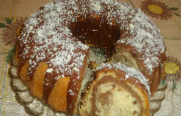 В намаслена и набрашнена кексова форма сипваме половината бяла смес, отгоре какаото и покриваме с останалата бяла смес. Печем в загрята на 180 градуса фурна за около 40-45 мин. до суха клечка. Изваждаме от формата и поставяме в чиния.