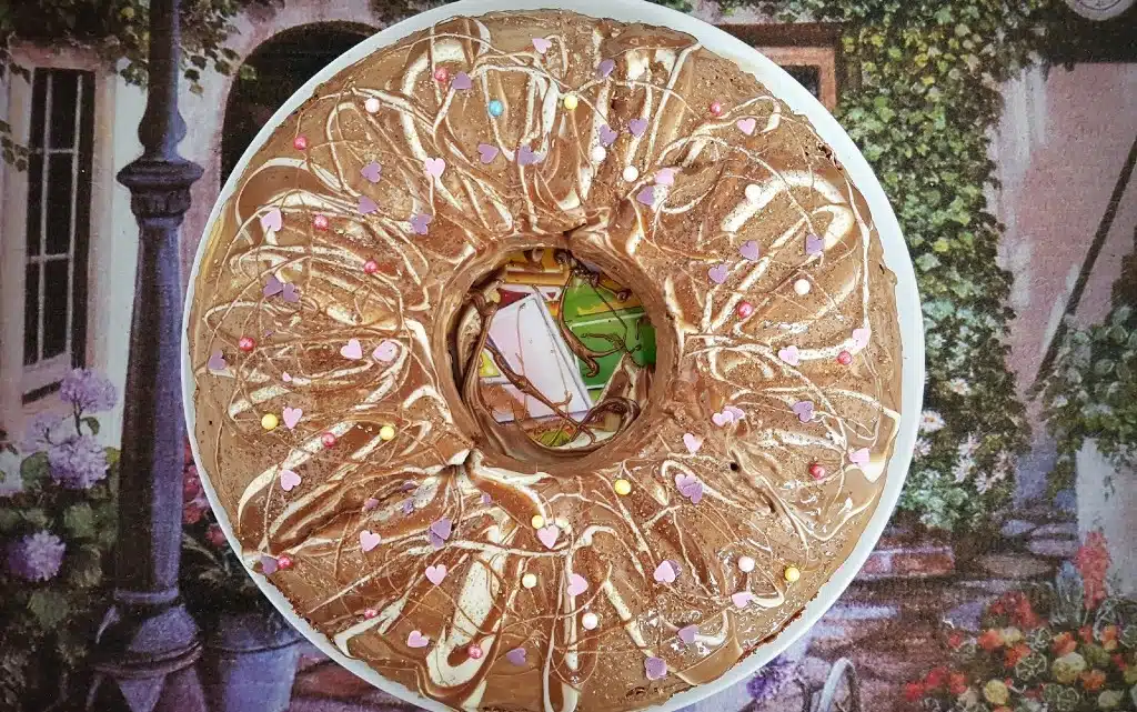 Охлаждаме го и украсяваме с течен шоколад и захарни фигурки. Да ви е сладко!