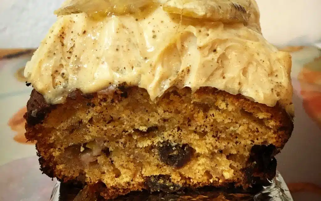 За сглобяването изваждаме кекса от формата и го прехвърляме в чиния. Намазваме обилно с глазурата и отгоре подреждаме карамелизираните банани.
