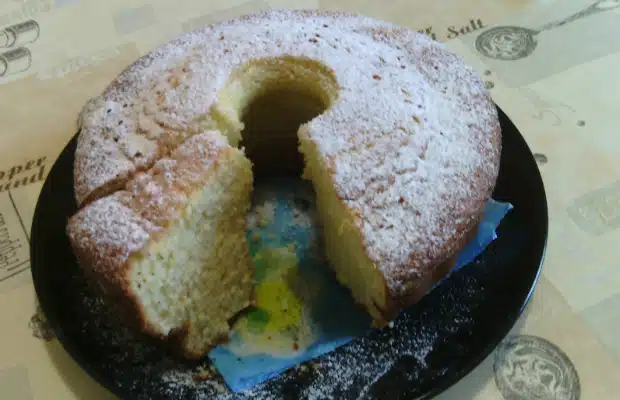 Вече опечен, го вадим, слагаме в кръгла чиния и поръсваме с пудра захар. Хапваме с кафе. Да ви е сладко! Става много висок и бухнал, апетитен с аромат на ванилия.
