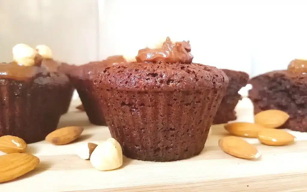 Украсяваме кексчетата с течен шоколад и лешник върху него.