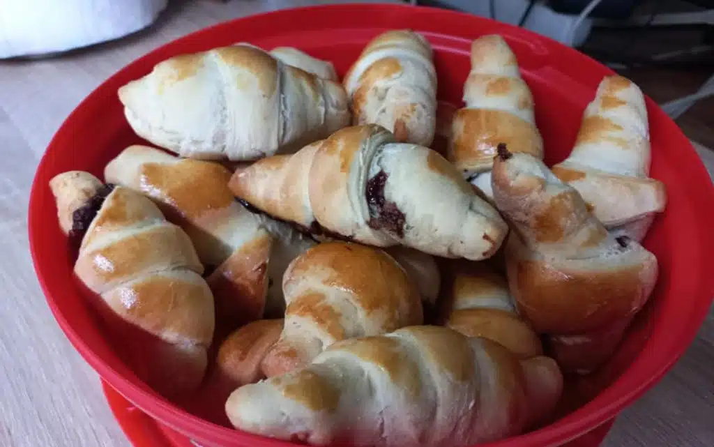 В широкия край се поставя лъжичка течен шоколад и навиваме кифлички. Нареждат се в тава. Намазваме ги с разбит жълтък. Печем в загрята фурна 180 градуса до златисто за 20-25 минути.